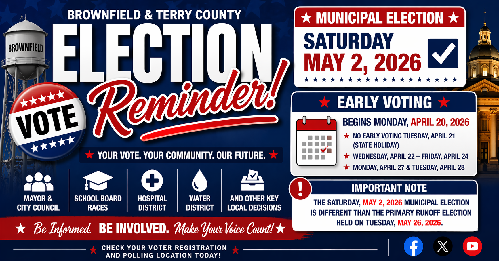 As always, local elections often have the most direct impact on daily life—from streets and utilities to schools and public safety. That makes participation in these races especially important for the future of Brownfield and Terry County.