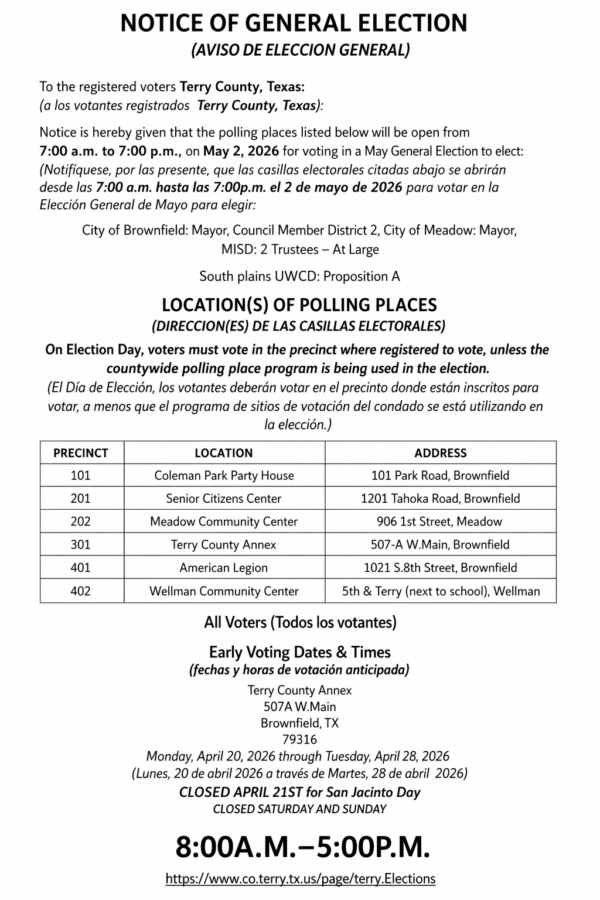 With early voting now complete, attention turns to Election Day, where several contested races and a key proposition will be decided by voters across Terry County.